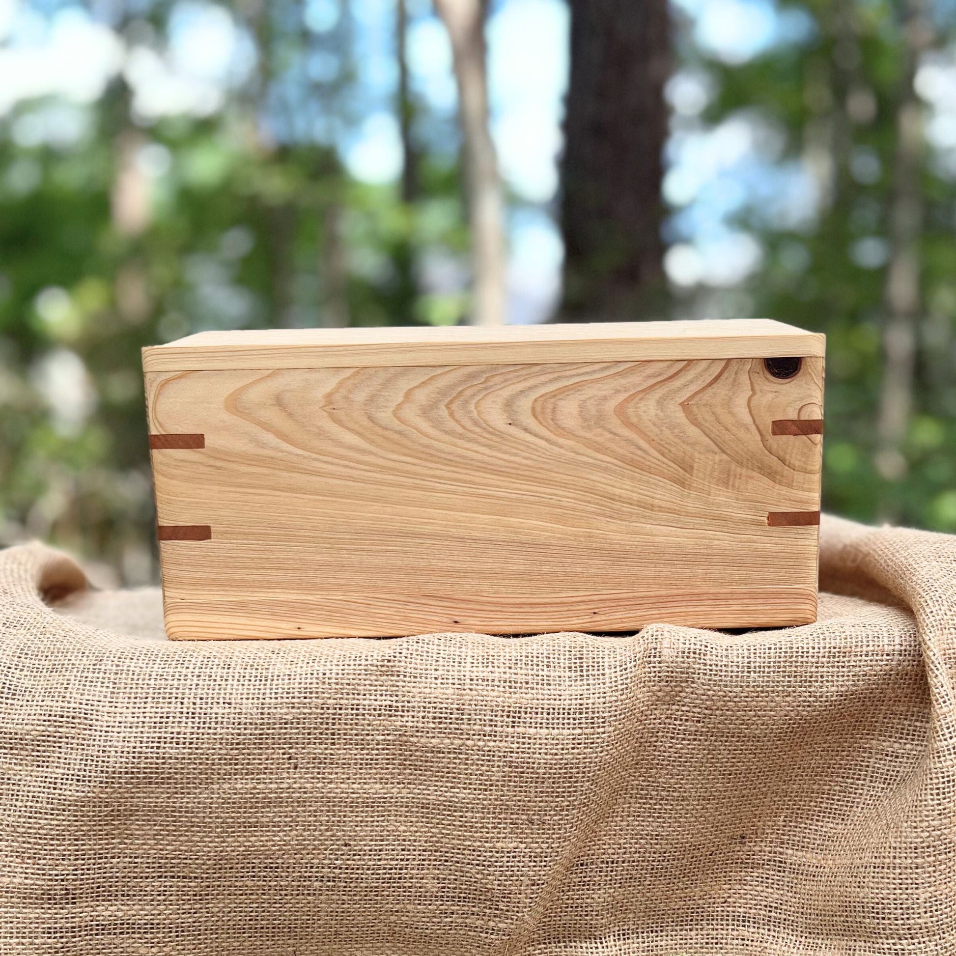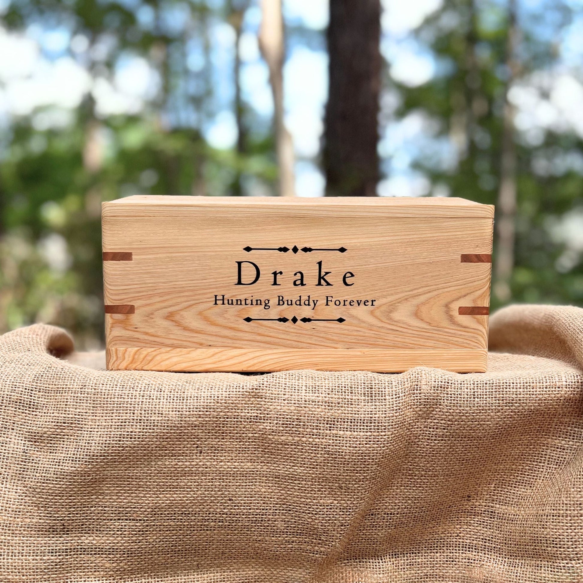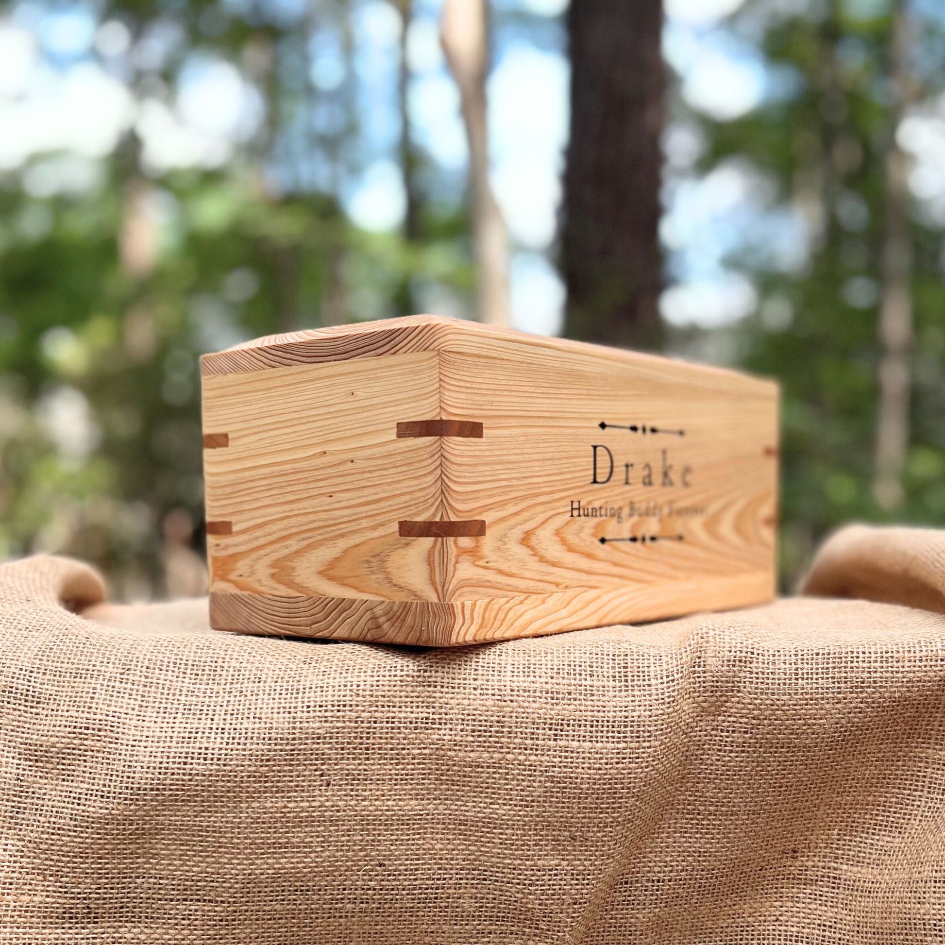 Custom, handmade solid Cypress pet urn or memorial box with solid Cherry splines. Choose your size and customize the nameplate and top image. We make these urns with love and care as a final resting place for your beloved pet's cremains and/or keepsakes like a leash, collar, tags or small toy. Keep your pet's memory near with this beautiful memorial.