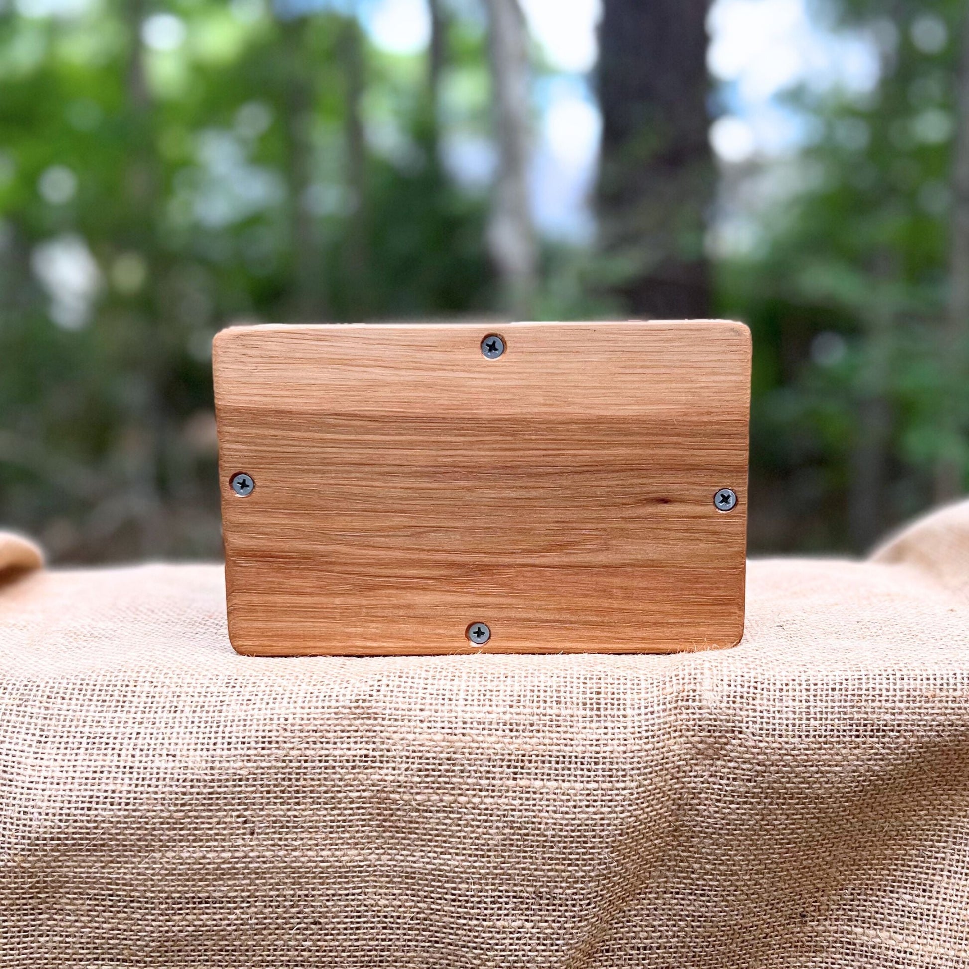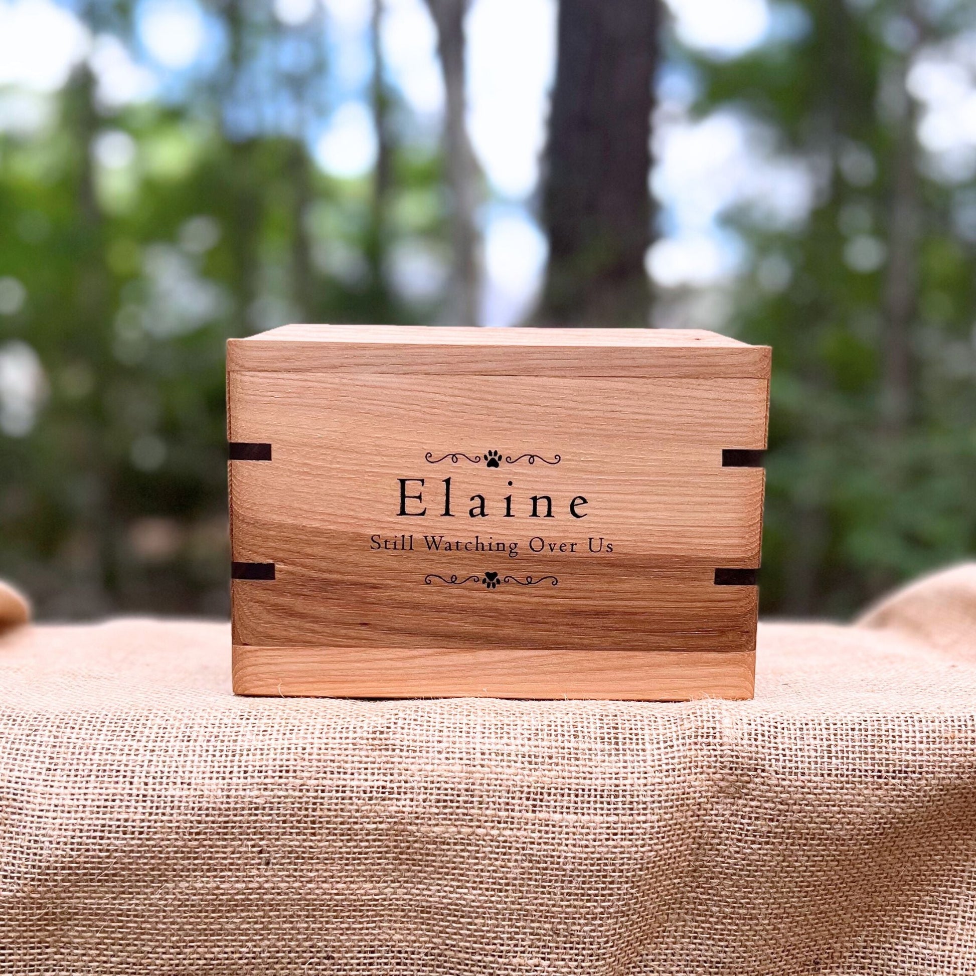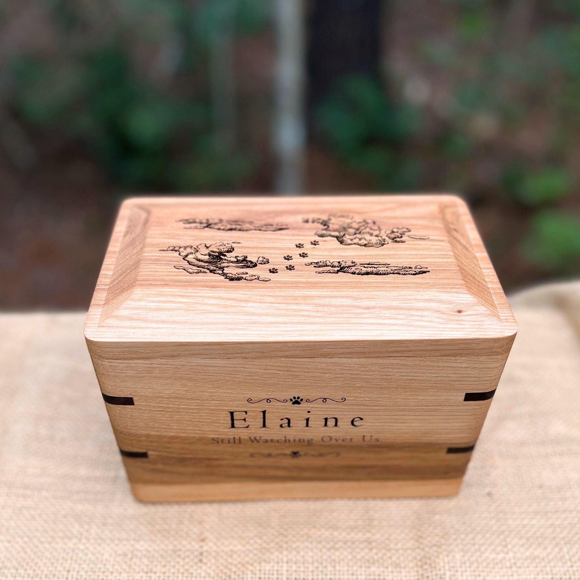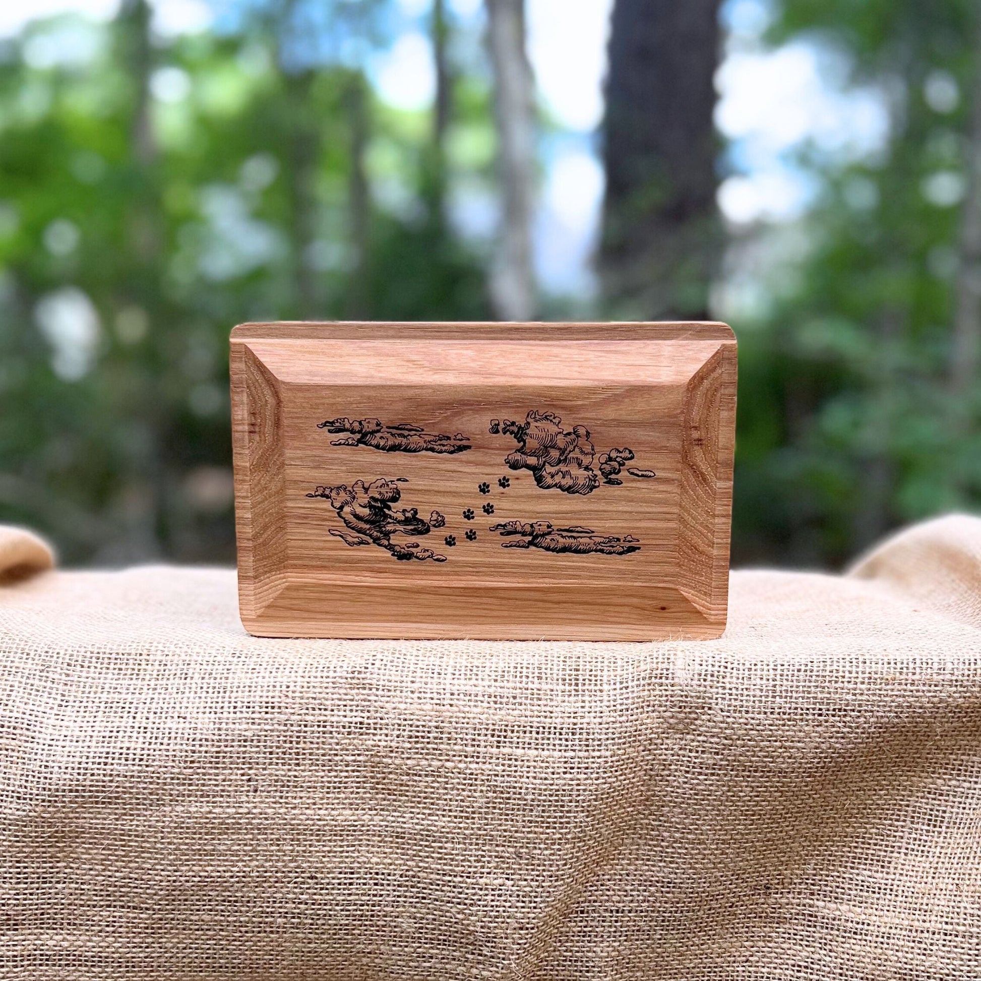 Custom, handmade solid Hickory pet urn or memorial box with solid Walnut splines. Choose your size and customize the nameplate and top image. We make these urns with love and care as a final resting place for your beloved pet's cremains and/or keepsakes like a leash, collar, tags or small toy. Keep your pet's memory near with this beautiful memorial.