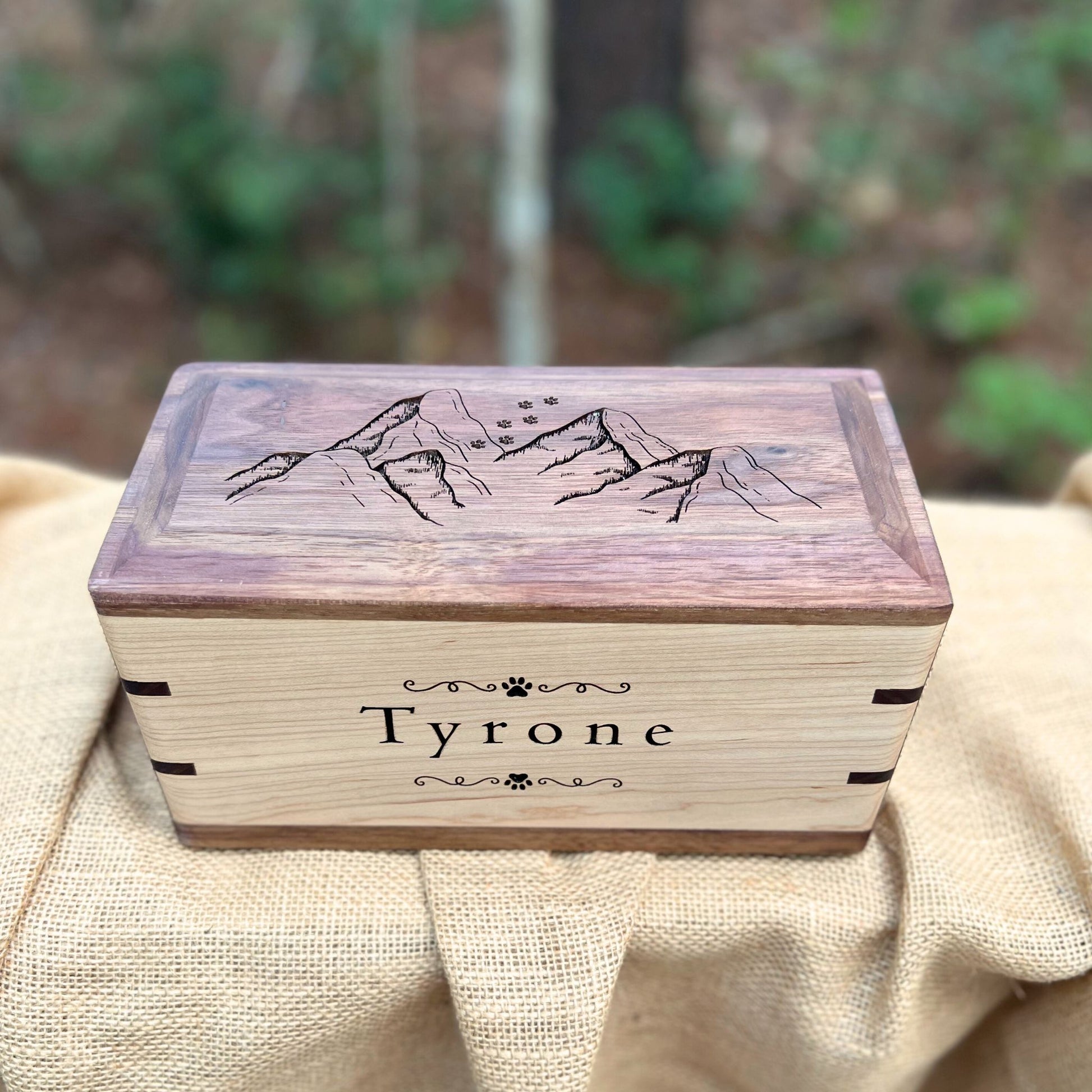 Custom, handmade solid Walnut pet urn or memorial box with solid Maple front and splines. Choose your size and customize the nameplate and top image. We make these urns with love and care as a final resting place for your beloved pet's cremains and/or keepsakes like a leash, collar, tags or small toy. Keep your pet's memory near with this beautiful memorial.