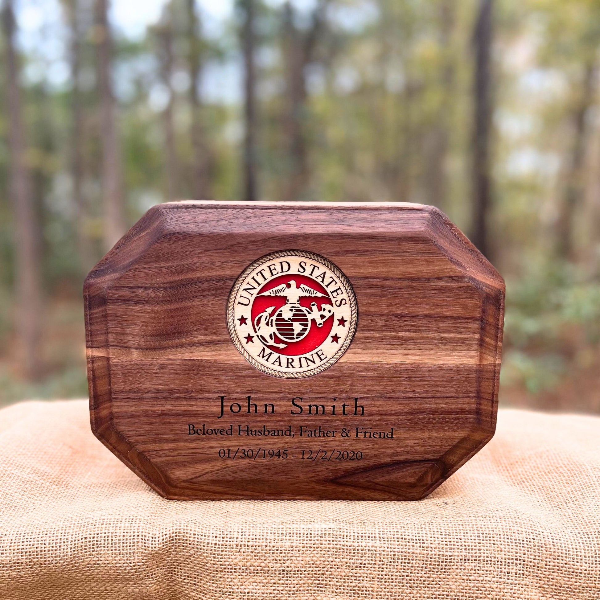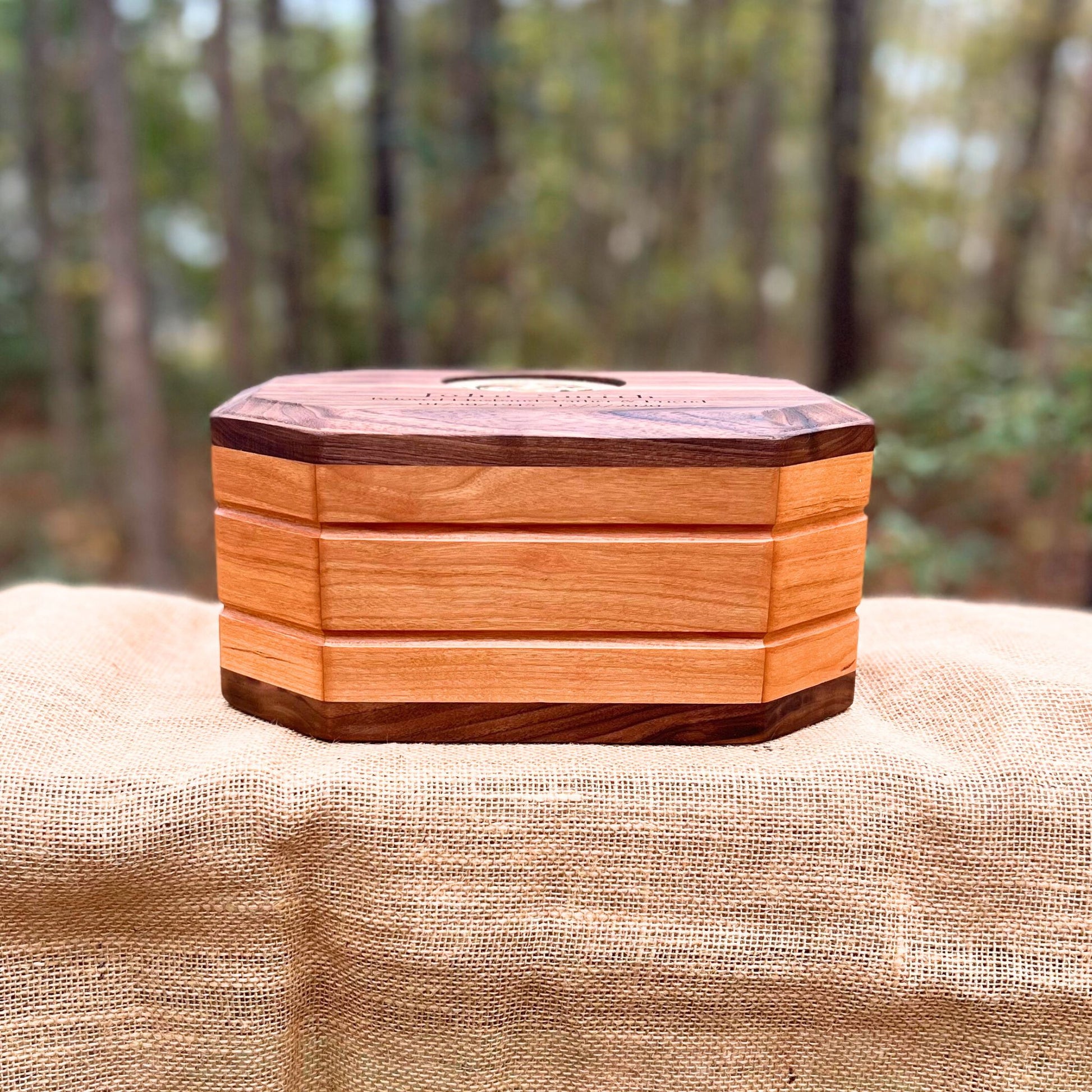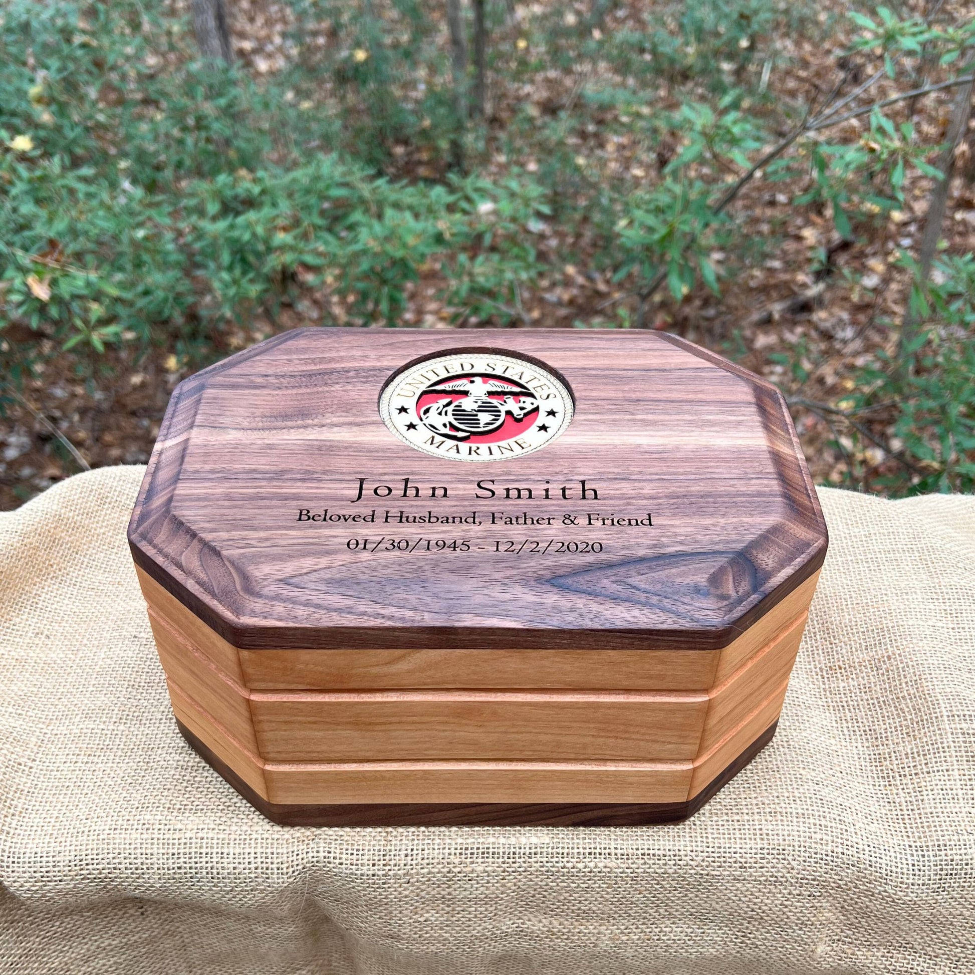 Handmade solid Walnut and Cherry 8-sided urn or memorial box with fluted sides and military logo inlay. Shown with engraving on top with 3.5" Military Emblem centered above engraving. Honor their service with this custom military urn or memorial box. We make these urns with love and care for your loved one's final resting place. This urn measures 11.5" wide x 8.5" deep x 5.5" tall and has a 240 cubic inch interior suitable for the cremains of someone up to 240 lbs. Keep your loved one's memory near with this beautiful urn.