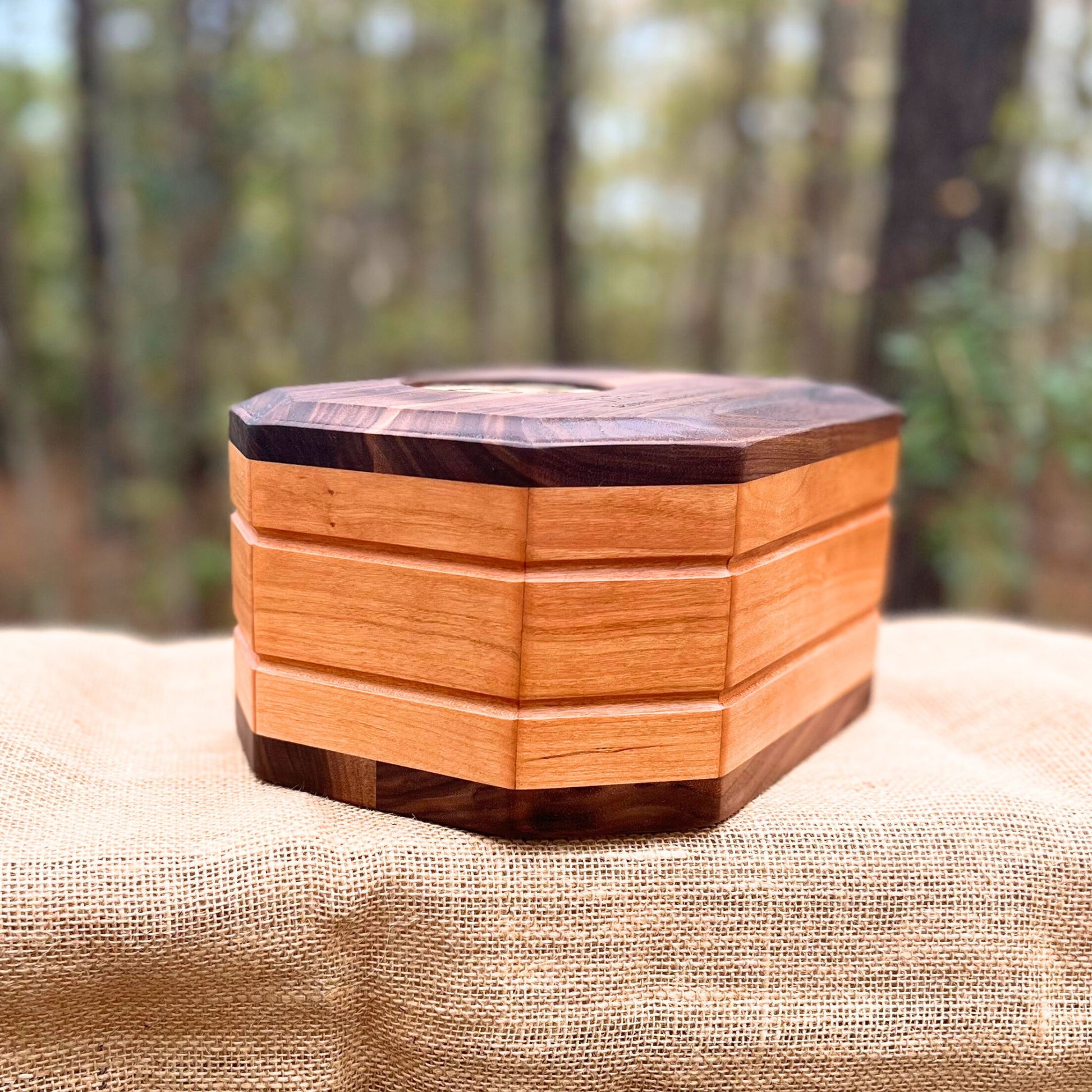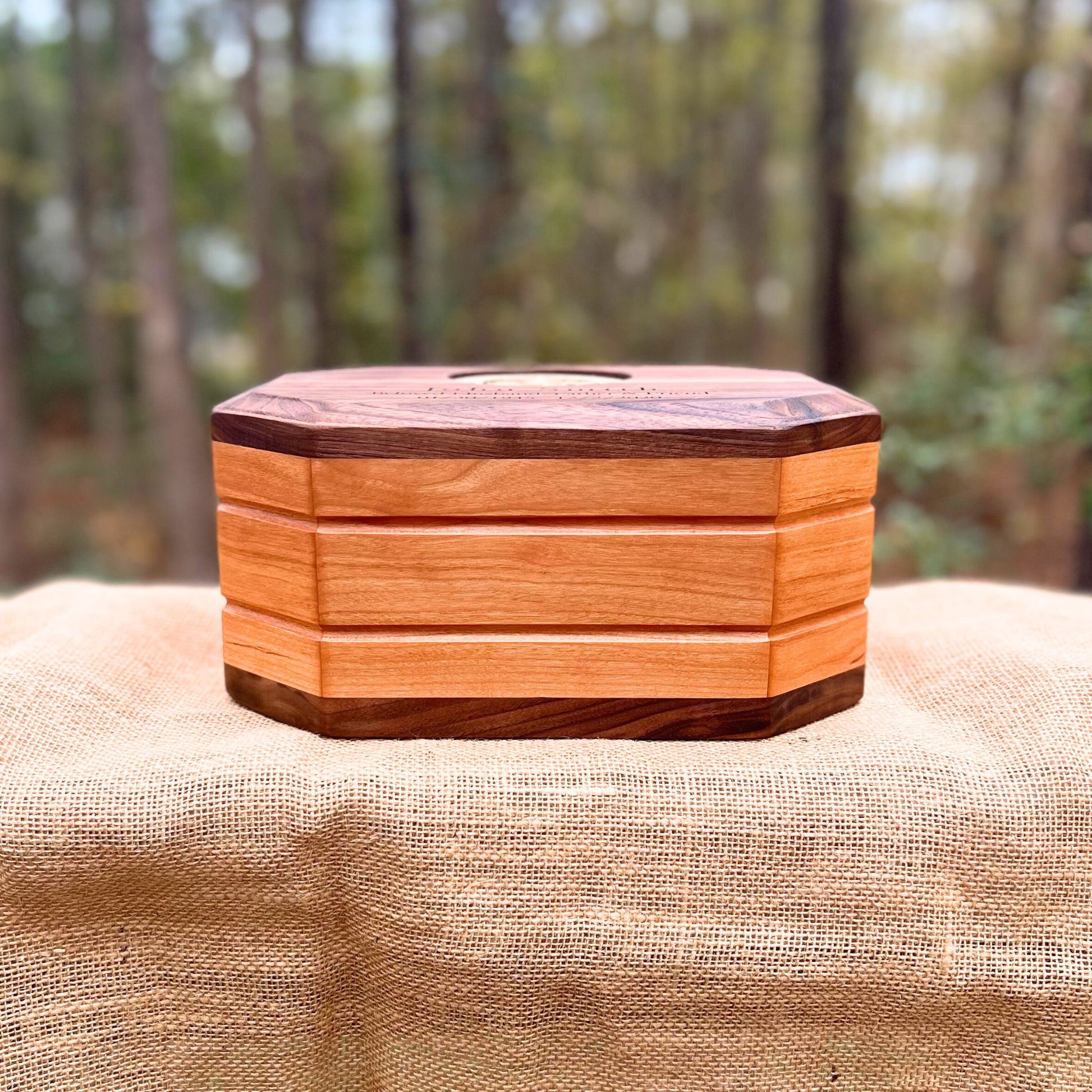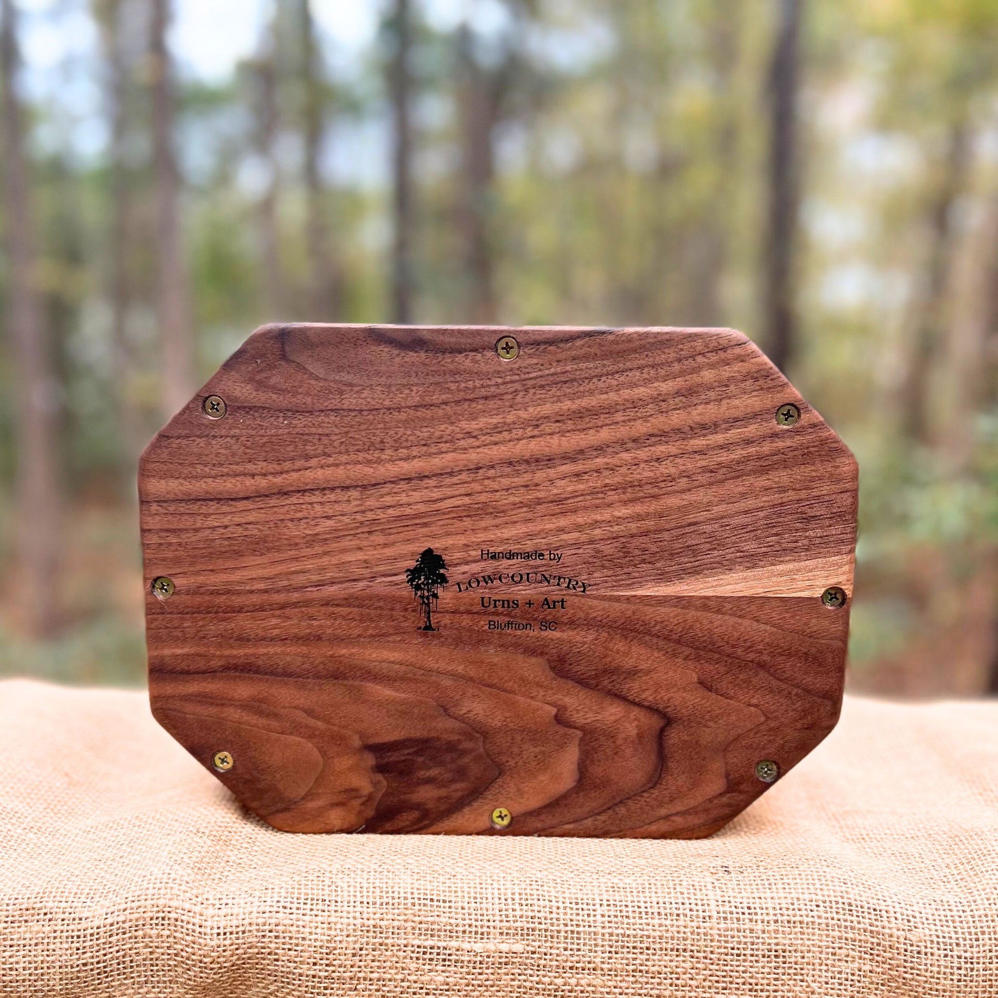 Handmade solid Walnut and Cherry 8-sided urn or memorial box with fluted sides and military logo inlay. Shown with engraving on top with 3.5" Military Emblem centered above engraving. Honor their service with this custom military urn or memorial box. We make these urns with love and care for your loved one's final resting place. This urn measures 11.5" wide x 8.5" deep x 5.5" tall and has a 240 cubic inch interior suitable for the cremains of someone up to 240 lbs. Keep your loved one's memory near with this beautiful urn.