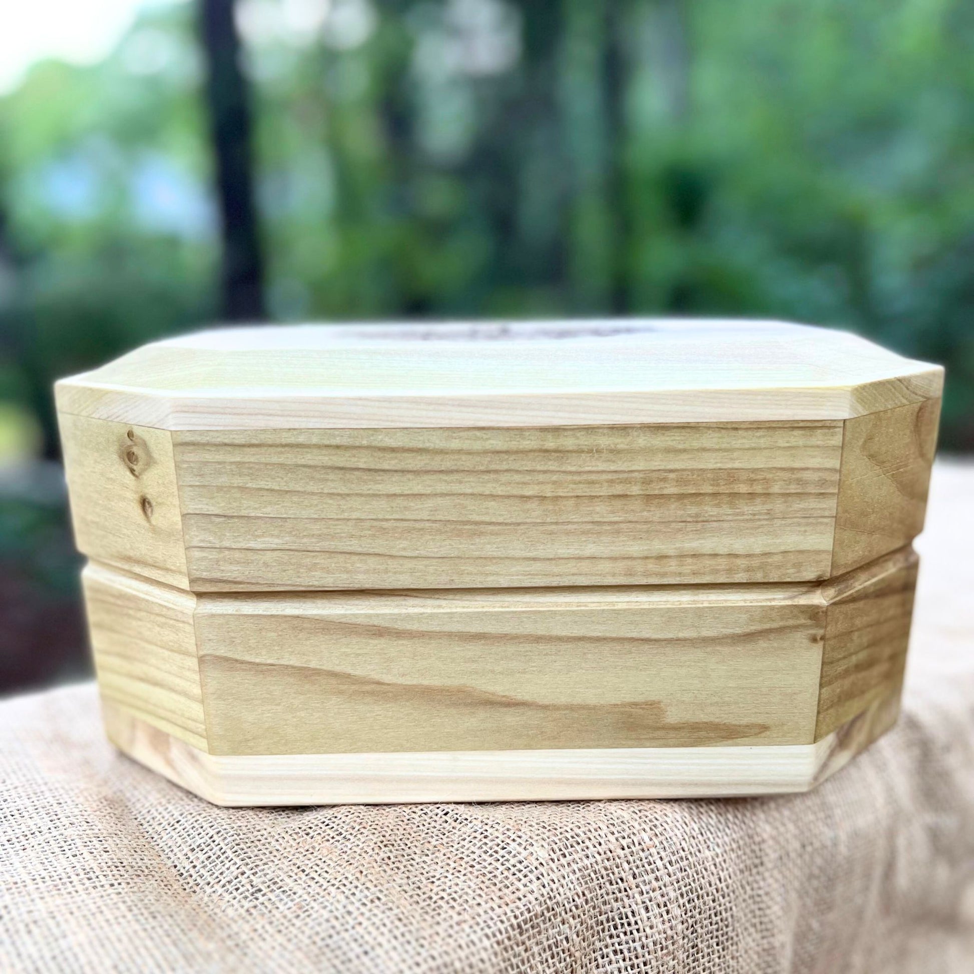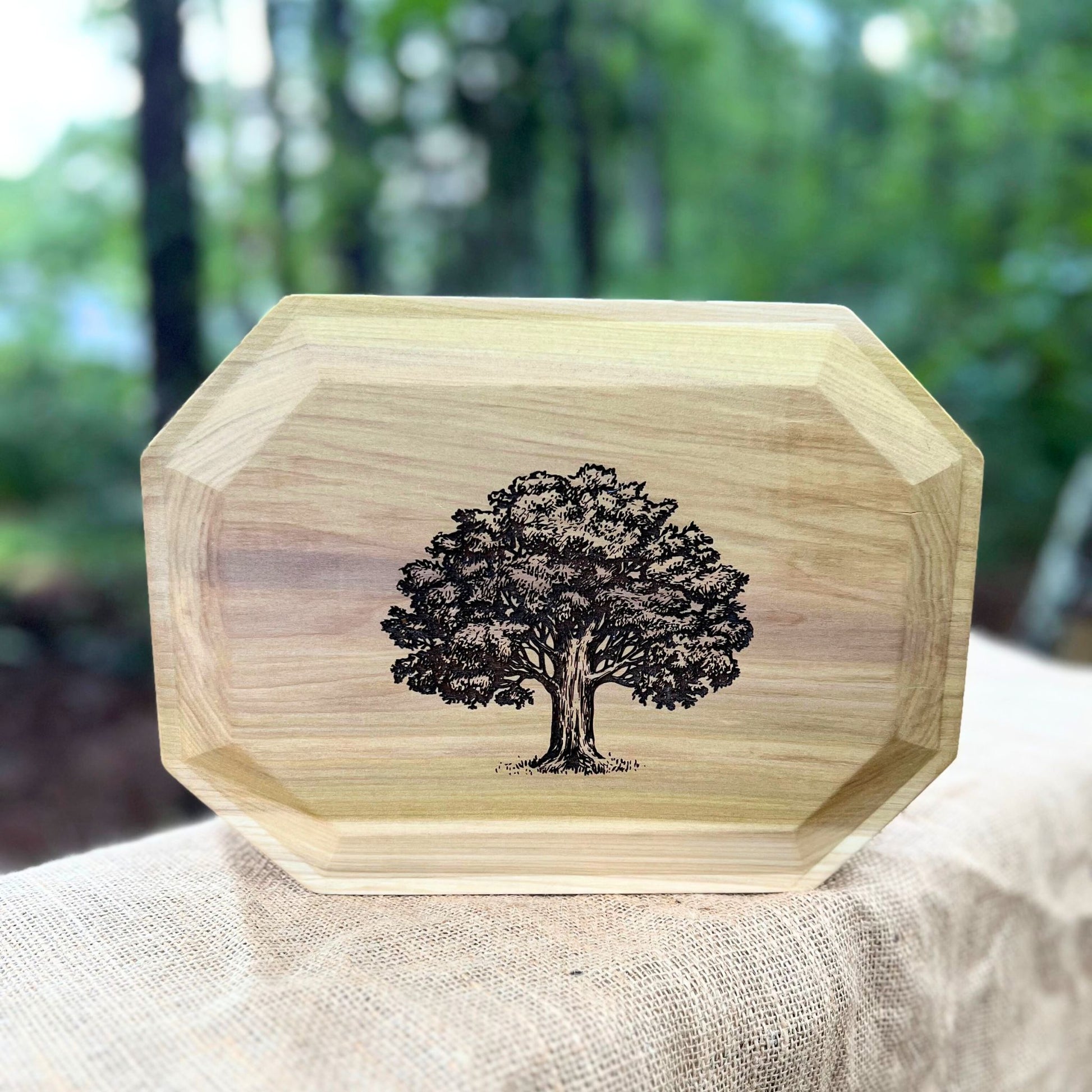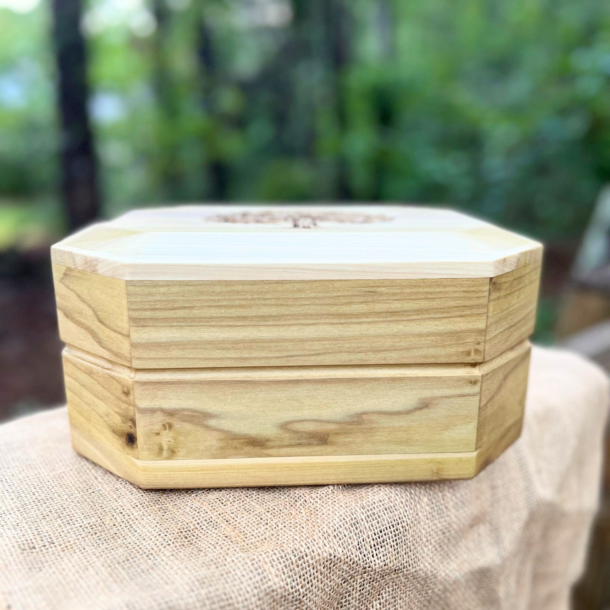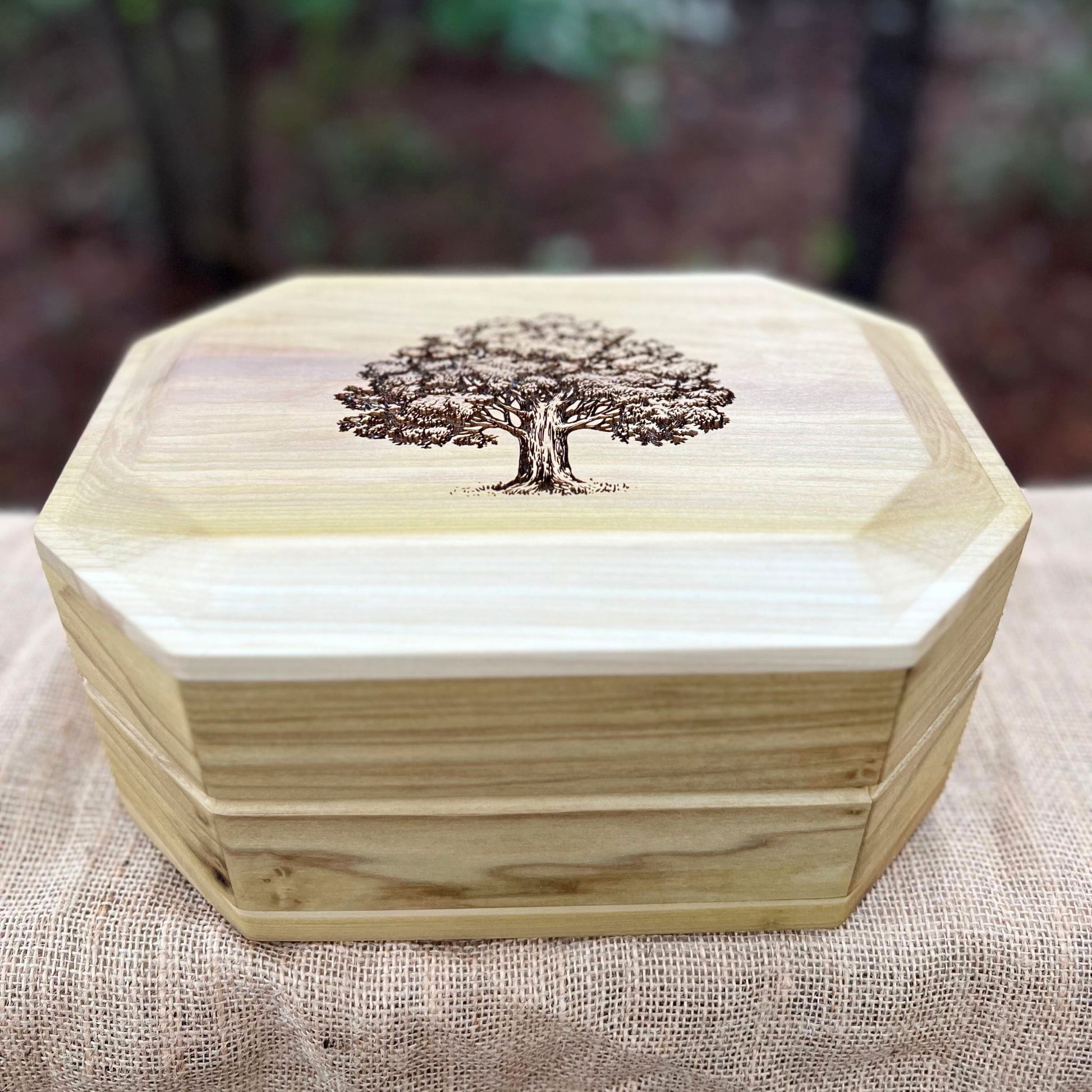 Handmade solid Poplar 8-sided urn or memorial box with fluted sides and Oak Tree engraving. We make these urns with love and care for your loved one's final resting place. This urn measures 11.5" wide x 8.5" deep x 5.5" tall and has a 240 cubic inch interior suitable for the cremains of someone up to 240 lbs. Keep your loved one's memory near with this beautiful urn.