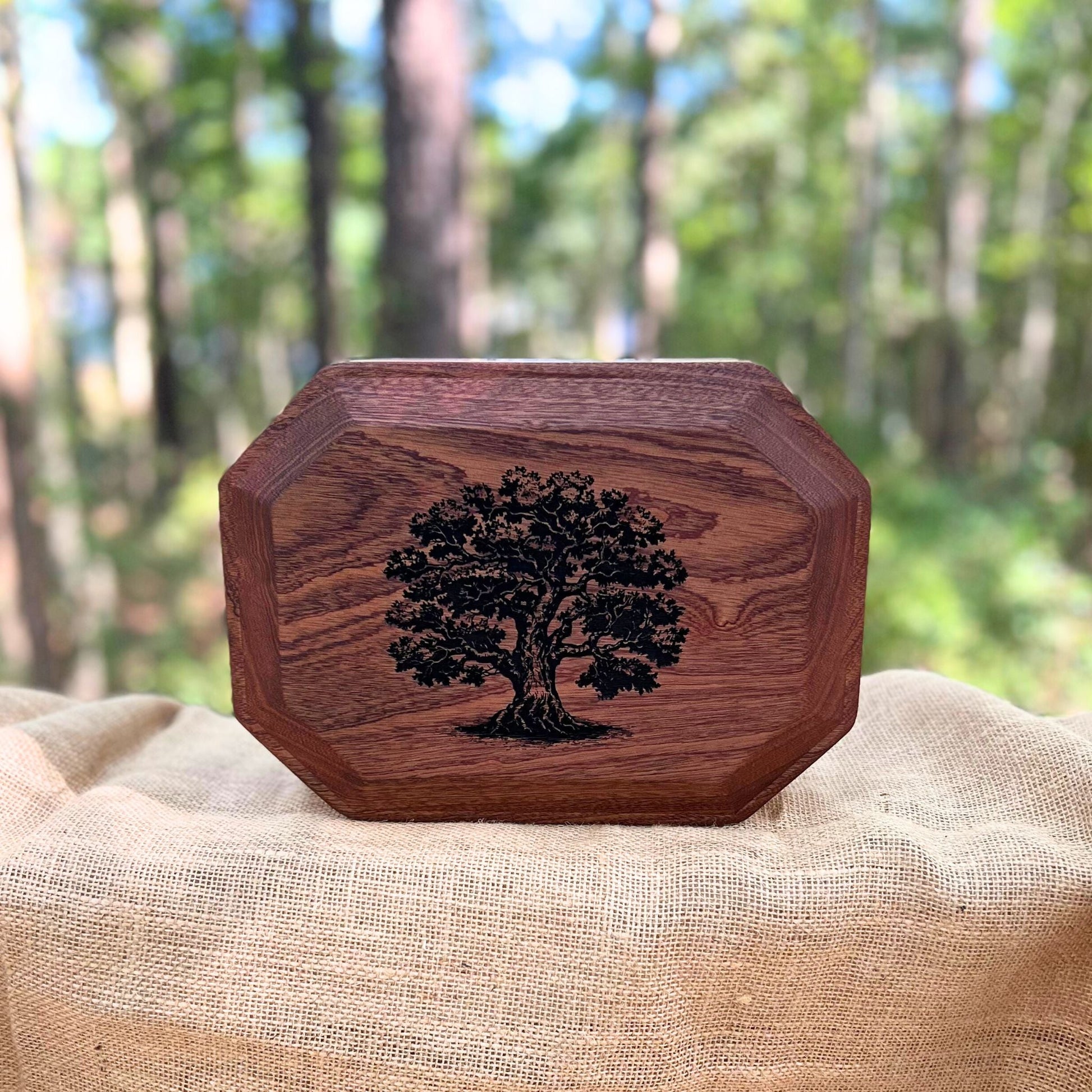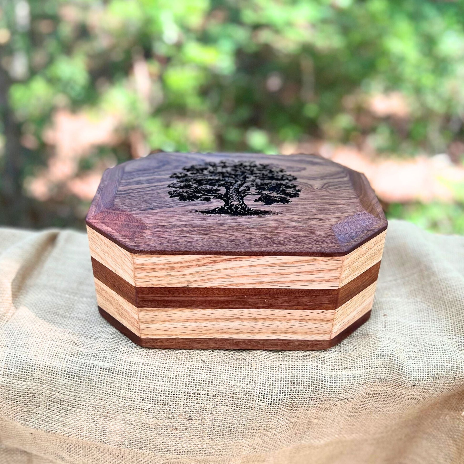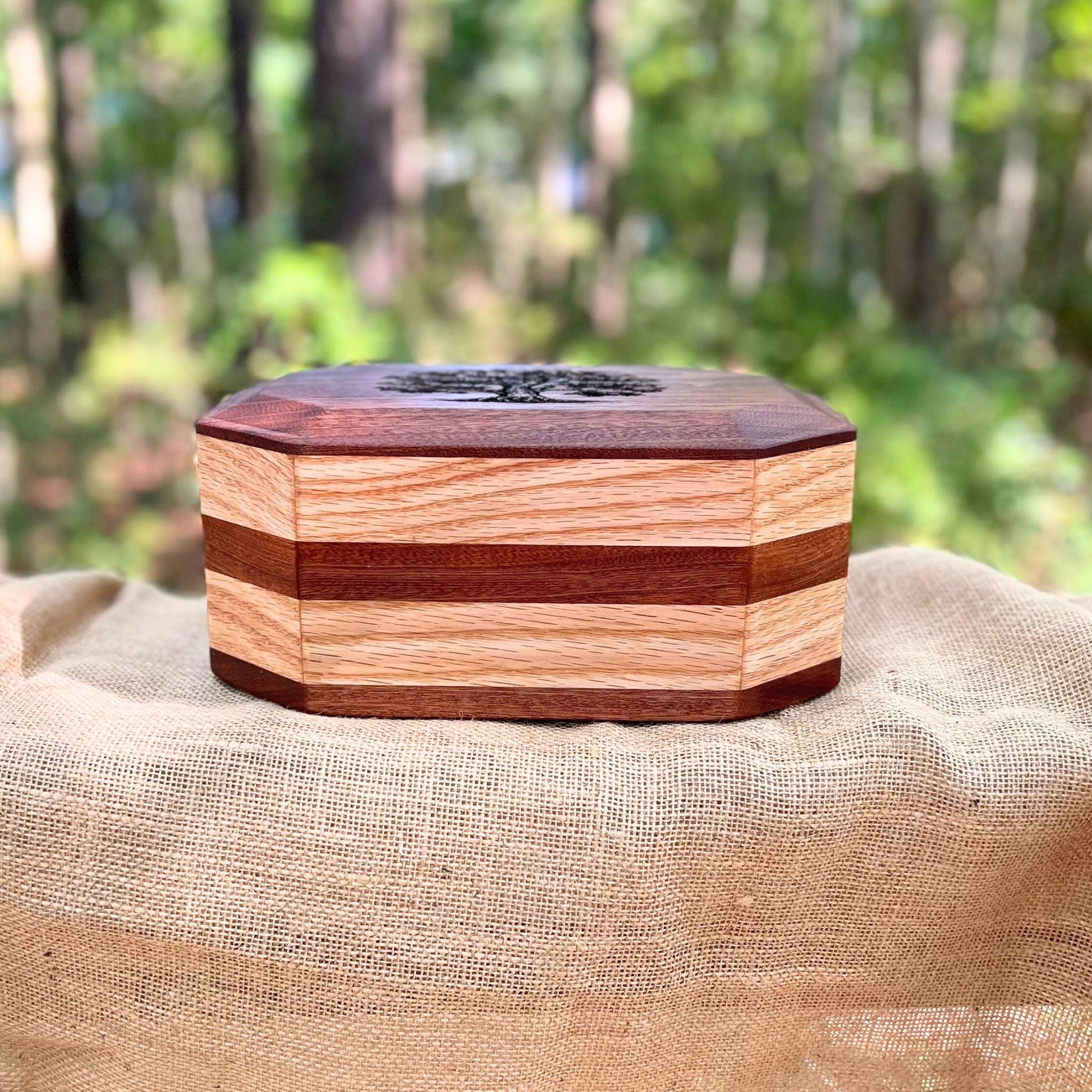 Handmade solid wood 8-sided urn with Sapele top/bottom and side inlay and Red Oak sides with Oak Tree of Life engraving. We make these urns with love and care for your loved one's final resting place. This urn measures 11.25 wide x 8.25" deep x 5.5" tall and has a 230 cubic inch interior suitable for the cremains of someone up to 230 lbs. Keep your loved one's memory near with this beautiful urn.