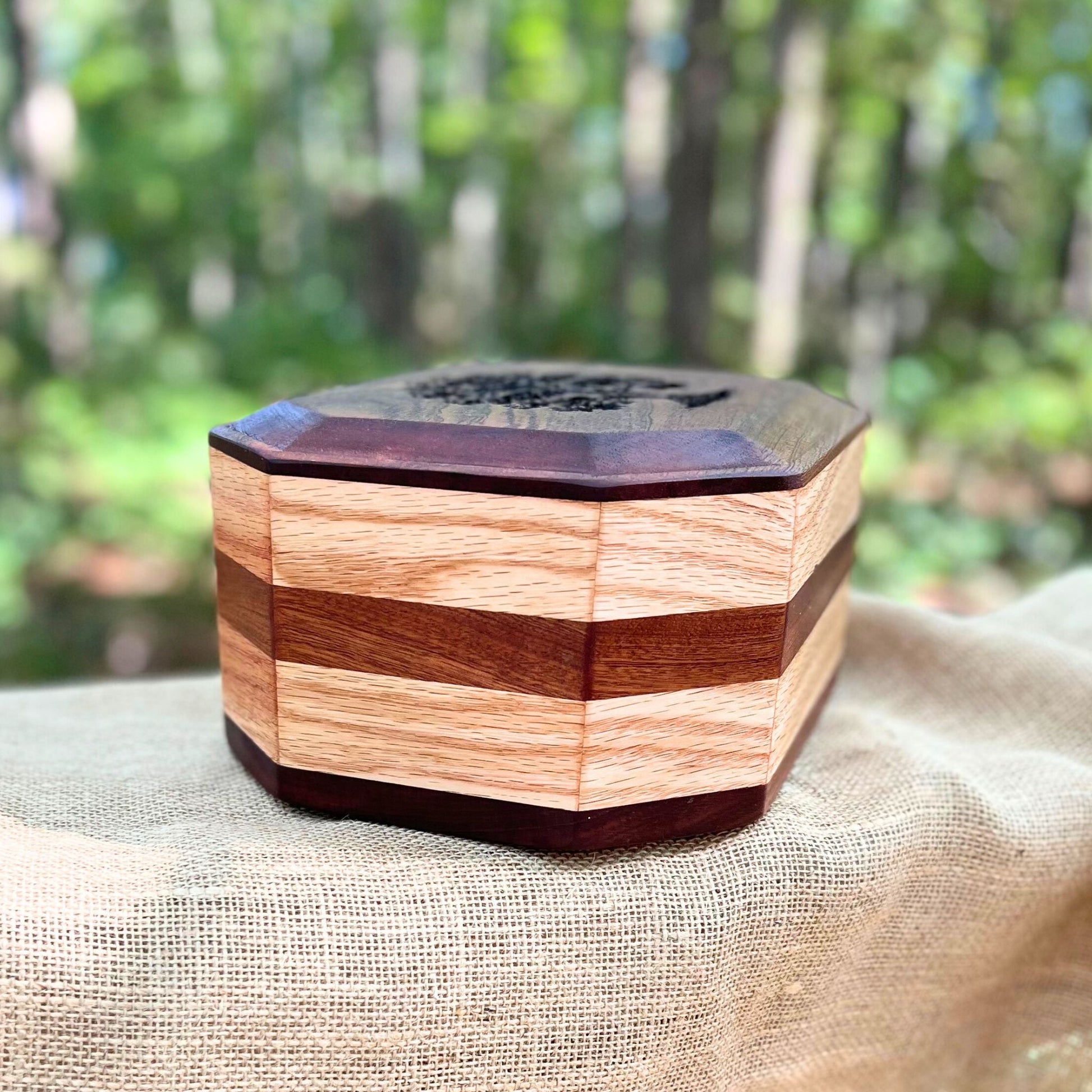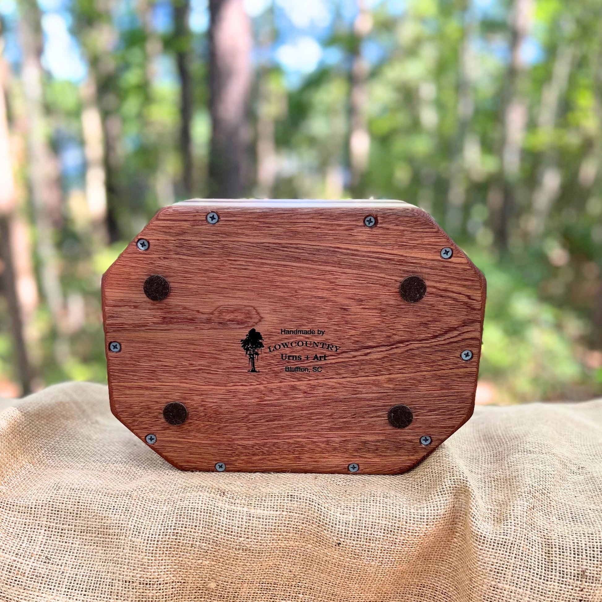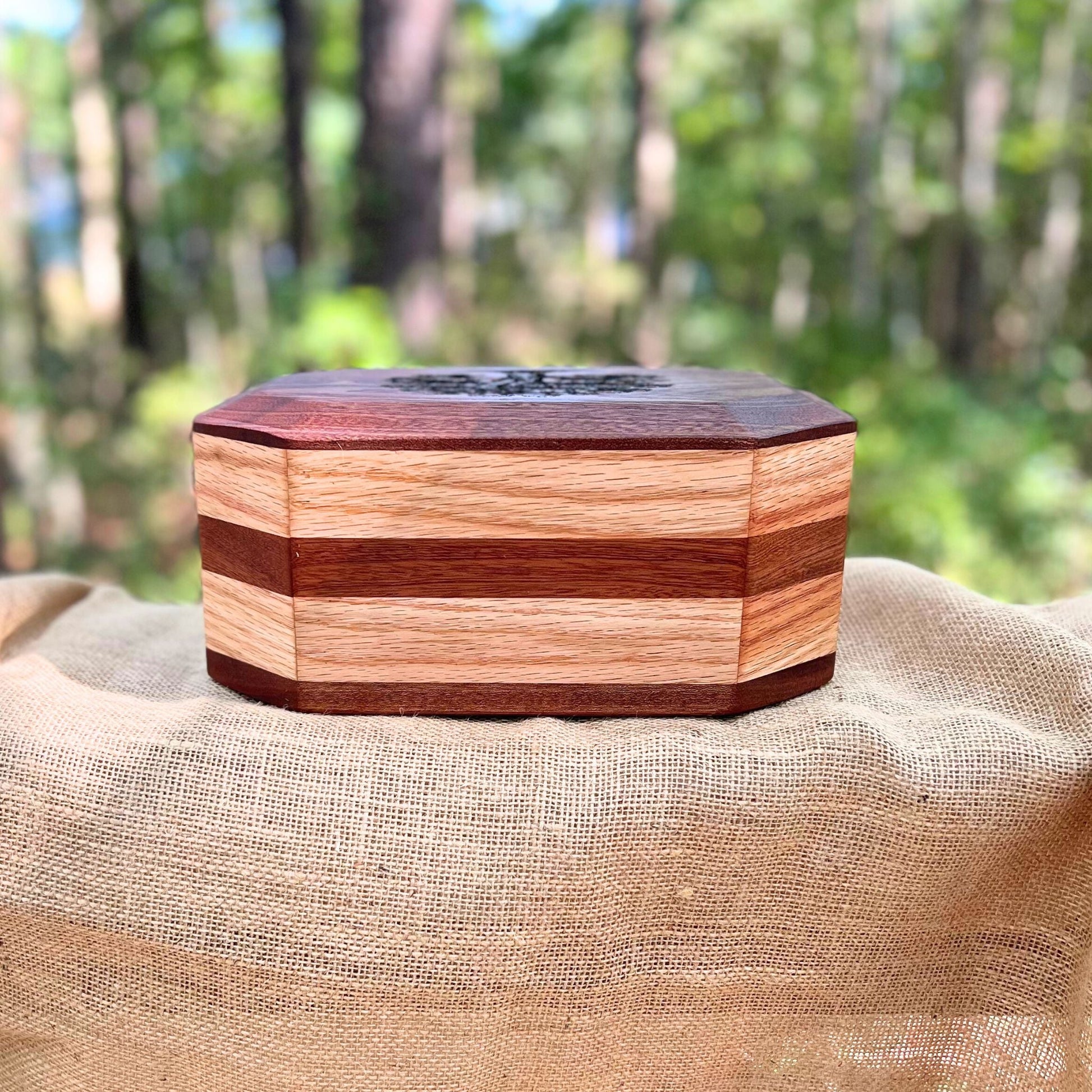 Handmade solid wood 8-sided urn with Sapele top/bottom and side inlay and Red Oak sides with Oak Tree of Life engraving. We make these urns with love and care for your loved one's final resting place. This urn measures 11.25 wide x 8.25" deep x 5.5" tall and has a 230 cubic inch interior suitable for the cremains of someone up to 230 lbs. Keep your loved one's memory near with this beautiful urn.