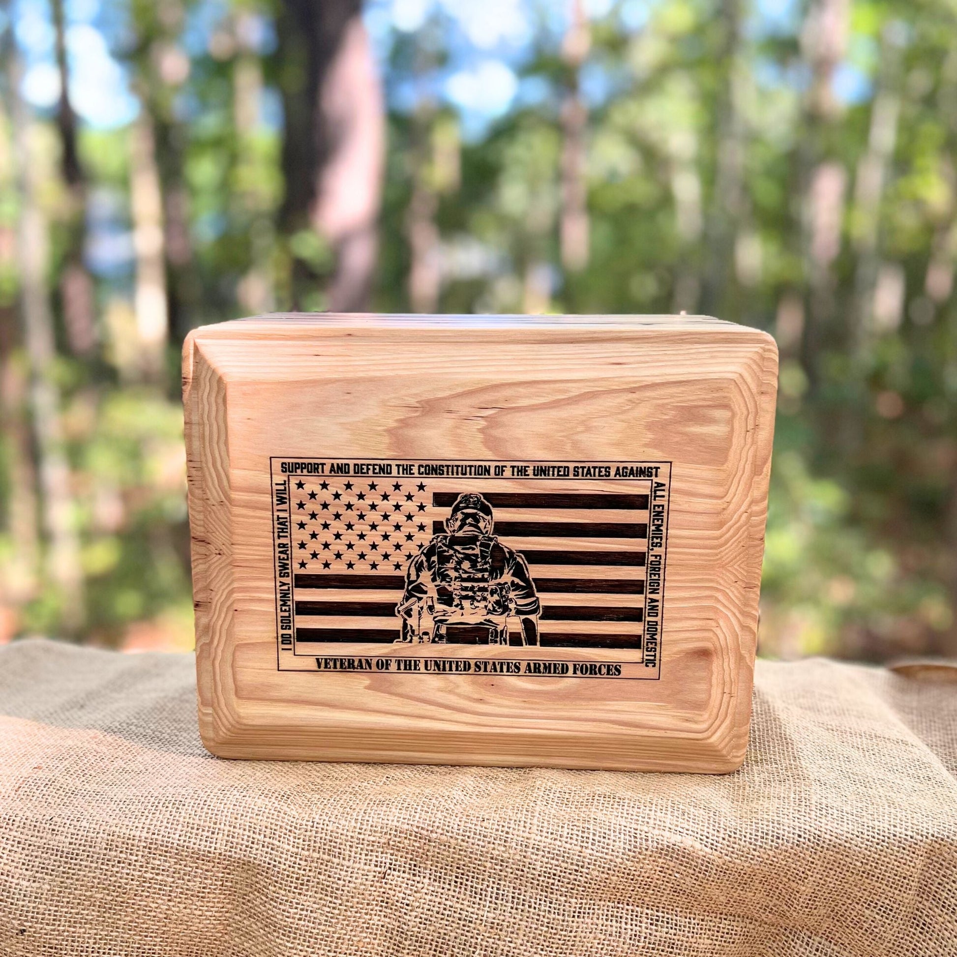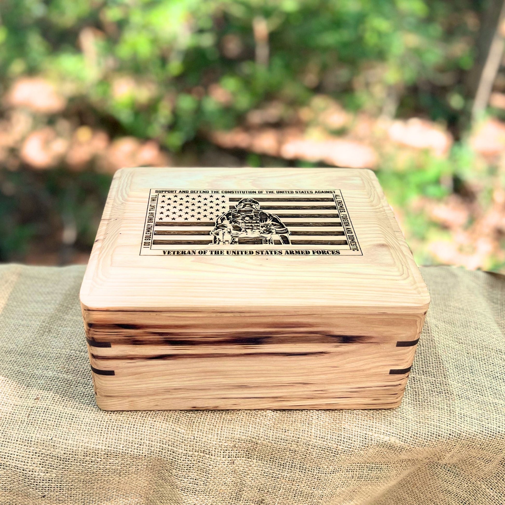 Handmade solid Hickory rectangle urn with walnut splines and Veteran's Oath Flag engraving. We make these urns with love and care for your loved one's final resting place. This urn measures 11" wide x 8.5" deep x 5.5" tall and has a 255 cubic inch interior suitable for the cremains of someone up to 255 lbs. Keep your loved one's memory near with this beautiful urn.